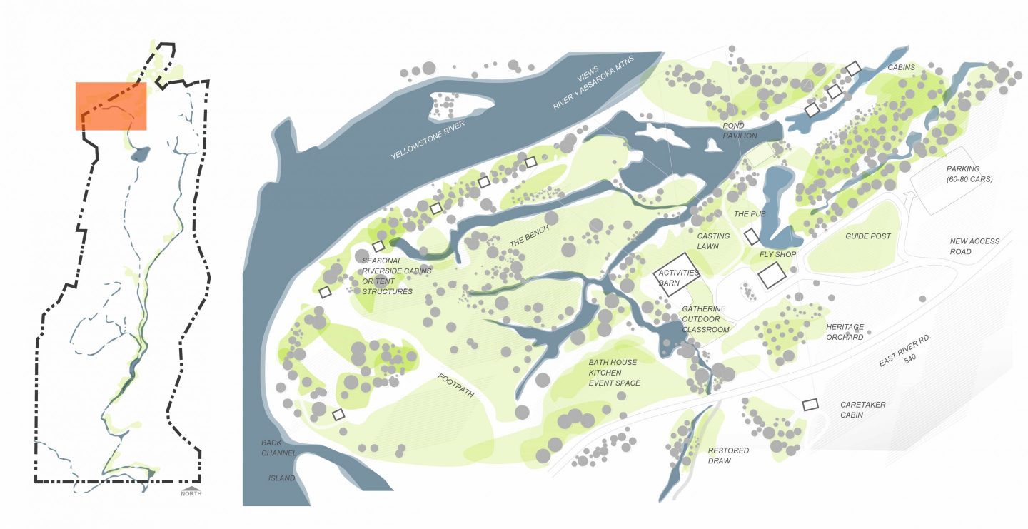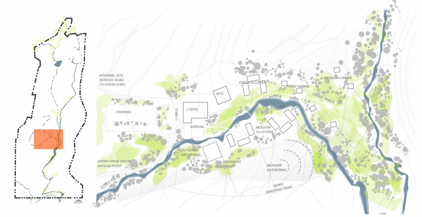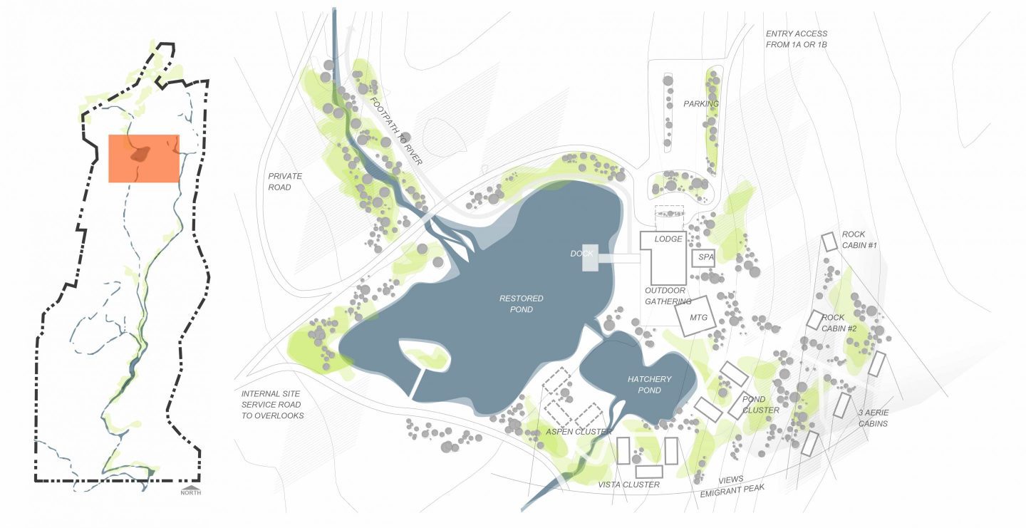 The Lodge is a fishing and retreat center located at the foot of a prominent peak in a pristine valley in Montana, providing a memorable destination for 60-100 guests on a premier fly fishing River. A modern mountain lodge welcomes guests with a stone hearth, restaurant, and bar, while cabins nestled into the hillside offer solitude within the big sky landscape. A Fishing Camp tucked along the riparian edge of the river hosts a meeting and training place for fishing guides and their clients while cabins along the upper bank and seasonal bunkhouses put guests right in the heart of the fishing experience.