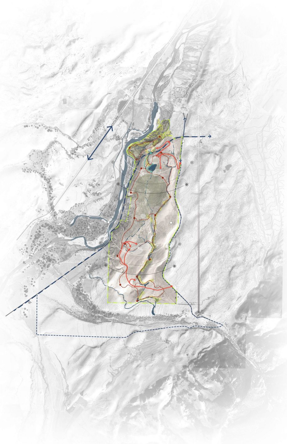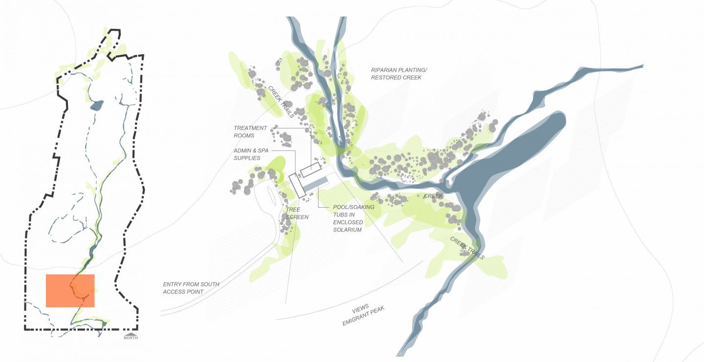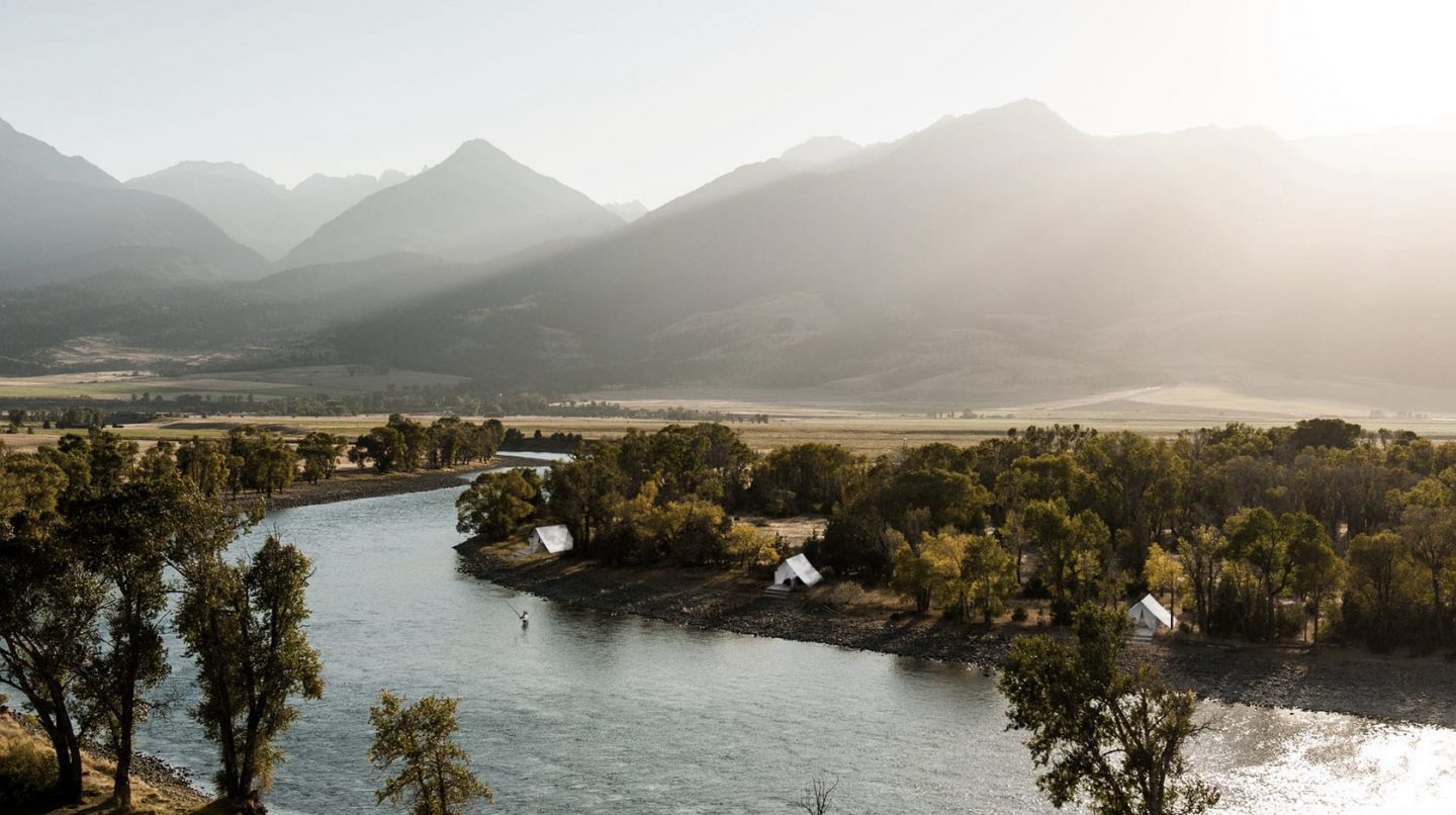 The Lodge is a fishing and retreat center located at the foot of a prominent peak in a pristine valley in Montana, providing a memorable destination for 60-100 guests on a premier fly fishing River. A modern mountain lodge welcomes guests with a stone hearth, restaurant, and bar, while cabins nestled into the hillside offer solitude within the big sky landscape. A Fishing Camp tucked along the riparian edge of the river hosts a meeting and training place for fishing guides and their clients while cabins along the upper bank and seasonal bunkhouses put guests right in the heart of the fishing experience.