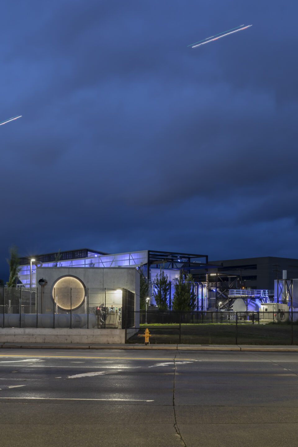 Viewed from outside the Station, the Theater of a Storm is a sequence of lighting events that indicates and tracks the stormwater treatment sequence. It starts with an 8-foot ring light that, like an on-button, represents the opening of the valve that allows the overflow of the stormwater to come into the plant. Then, the lighting sequence follows each actor as they enter the stage; the equalization basin, odor control, the UV scrubbers, and so on. When the event is over, the lights turn off one by one, in sequence.