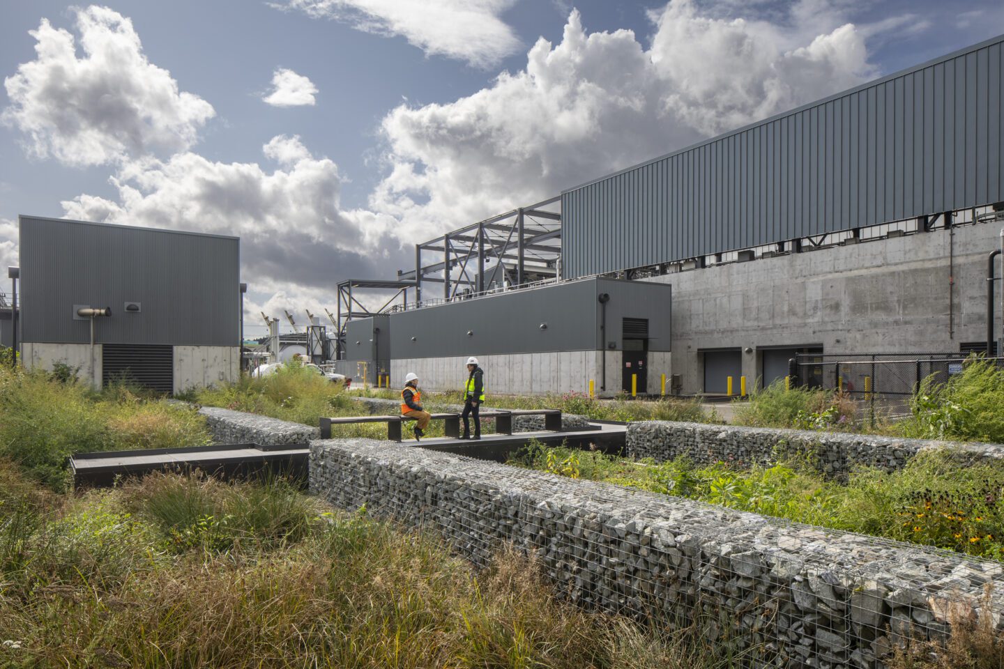 The design team also took the active buildings scaled exclusively for humans –workshops, offices, control rooms– and placed them right at the edge of the site inplace of a perimeter fence. This configuration lets passersby see that people are here, and activity is happening. Further inside the site, the things that are the noisiest, tallest and potentially emit odor are the furthest away from where people would be.