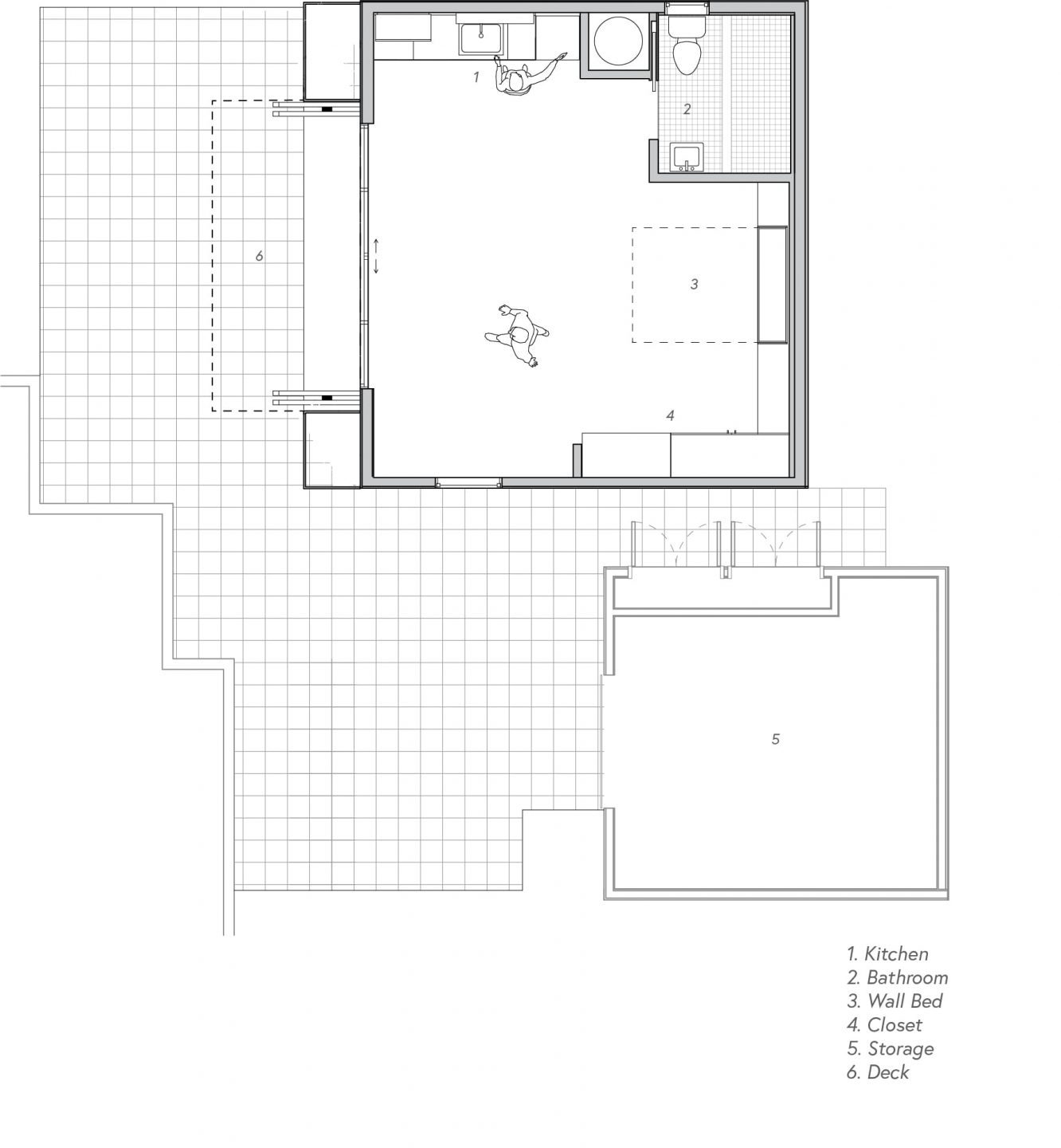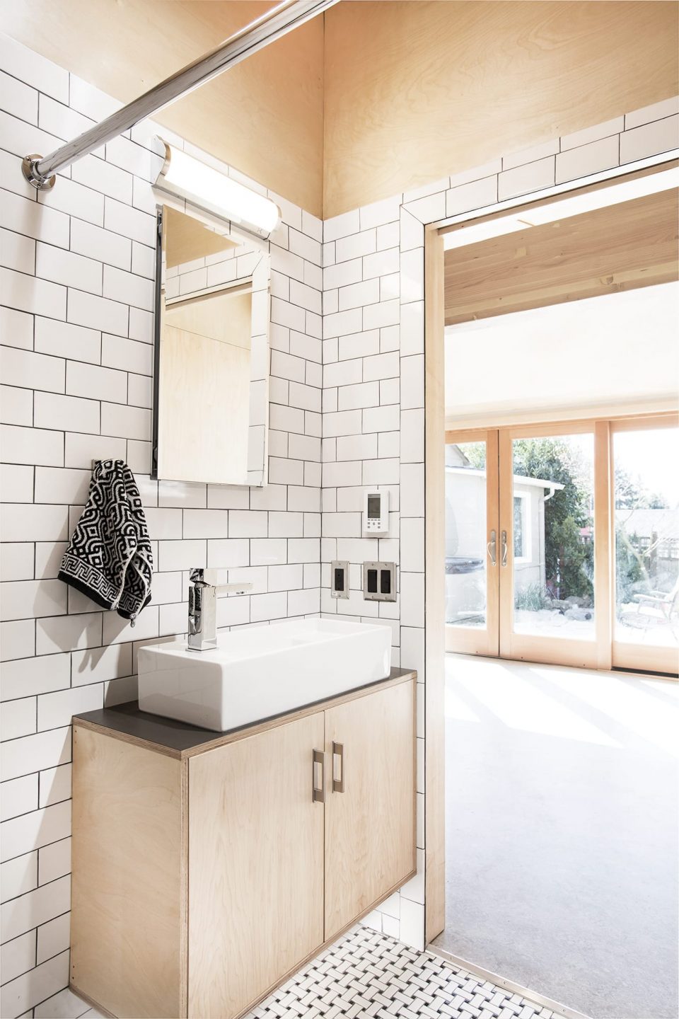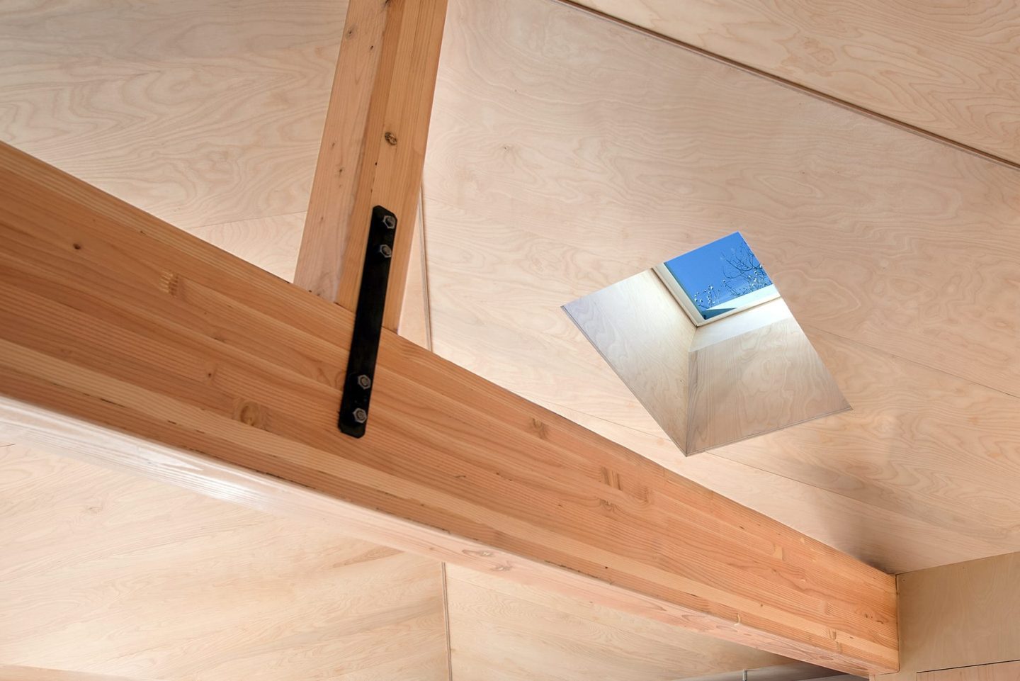 Interior plywood finishes, skylights, and a big sliding door transformed the humble garage from utilitarian storage to a warm, light filled studio and guest house that serves as the home base for long or short term visits, project retreats, or a home base for outdoor gatherings.